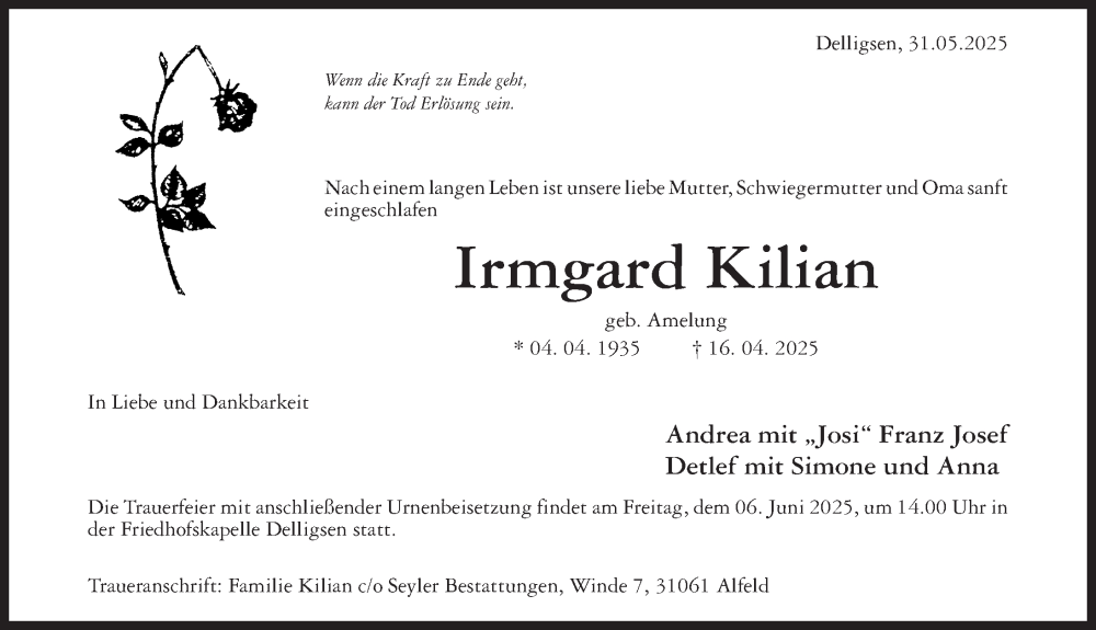 Hier finden Sie alle Traueranzeigen aus der Zeitung, die bisher für Irmgard Kilian erschienen sind. Weitere Traueranzeigen, die in der Zeitung erscheinen, werden hier ebenfalls aufgelistet