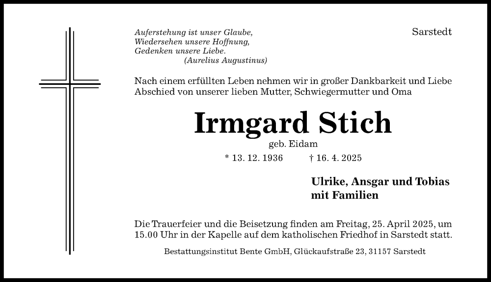 Hier finden Sie alle Traueranzeigen aus der Zeitung, die bisher für Irmgard Stich erschienen sind. Weitere Traueranzeigen, die in der Zeitung erscheinen, werden hier ebenfalls aufgelistet