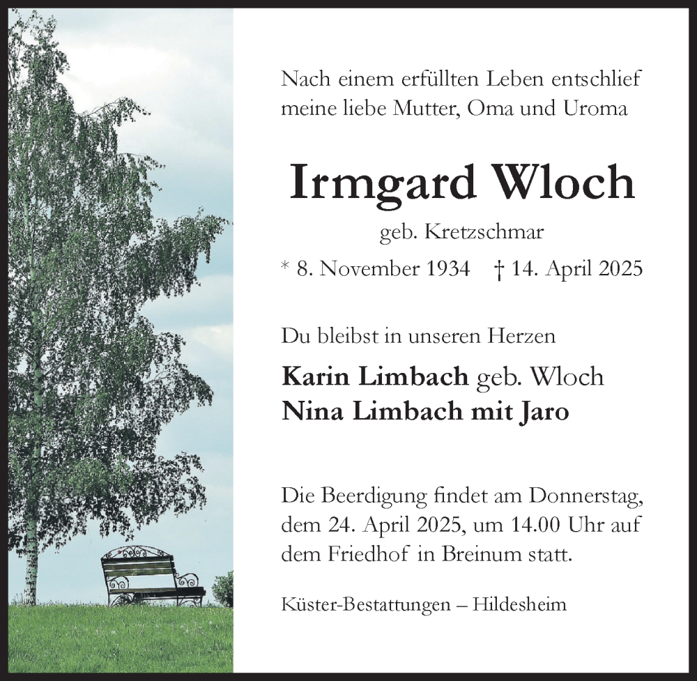 Hier finden Sie alle Traueranzeigen aus der Zeitung, die bisher für Irmgard Wloch erschienen sind. Weitere Traueranzeigen, die in der Zeitung erscheinen, werden hier ebenfalls aufgelistet