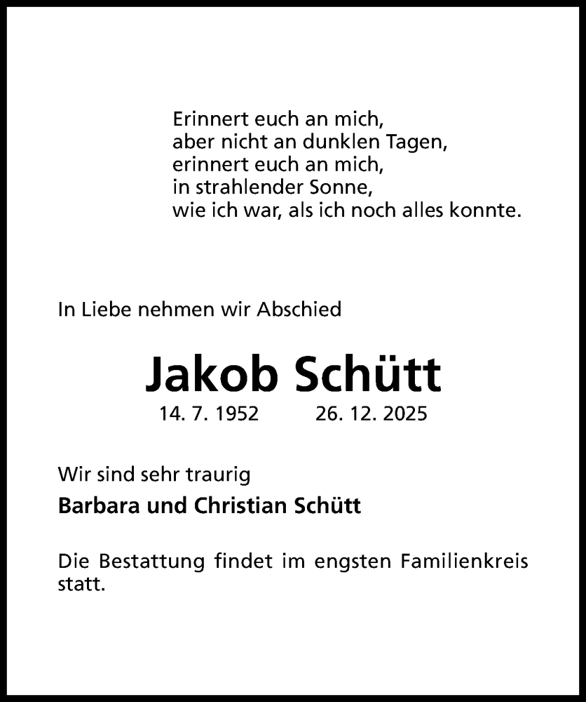 Hier finden Sie alle Traueranzeigen aus der Zeitung, die bisher für Jakob Schütt erschienen sind. Weitere Traueranzeigen, die in der Zeitung erscheinen, werden hier ebenfalls aufgelistet