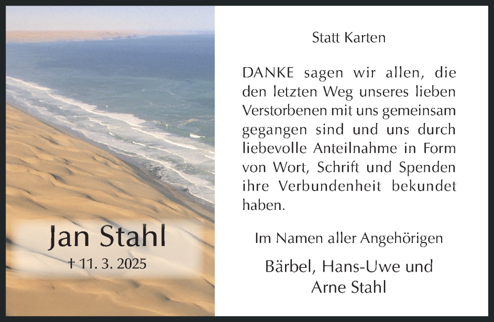 Hier finden Sie alle Traueranzeigen aus der Zeitung, die bisher für Jan Stahl erschienen sind. Weitere Traueranzeigen, die in der Zeitung erscheinen, werden hier ebenfalls aufgelistet