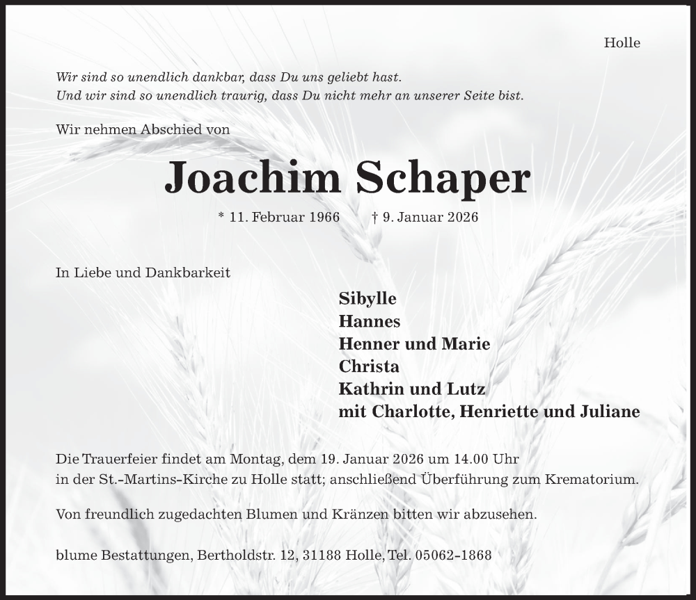 Hier finden Sie alle Traueranzeigen aus der Zeitung, die bisher für Joachim Schaper erschienen sind. Weitere Traueranzeigen, die in der Zeitung erscheinen, werden hier ebenfalls aufgelistet
