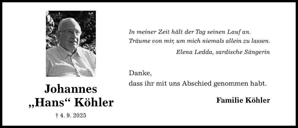 Hier finden Sie alle Traueranzeigen aus der Zeitung, die bisher für Johannes Köhler erschienen sind. Weitere Traueranzeigen, die in der Zeitung erscheinen, werden hier ebenfalls aufgelistet