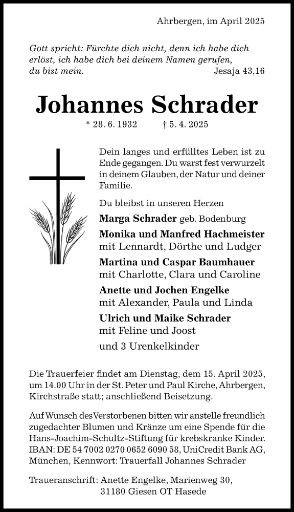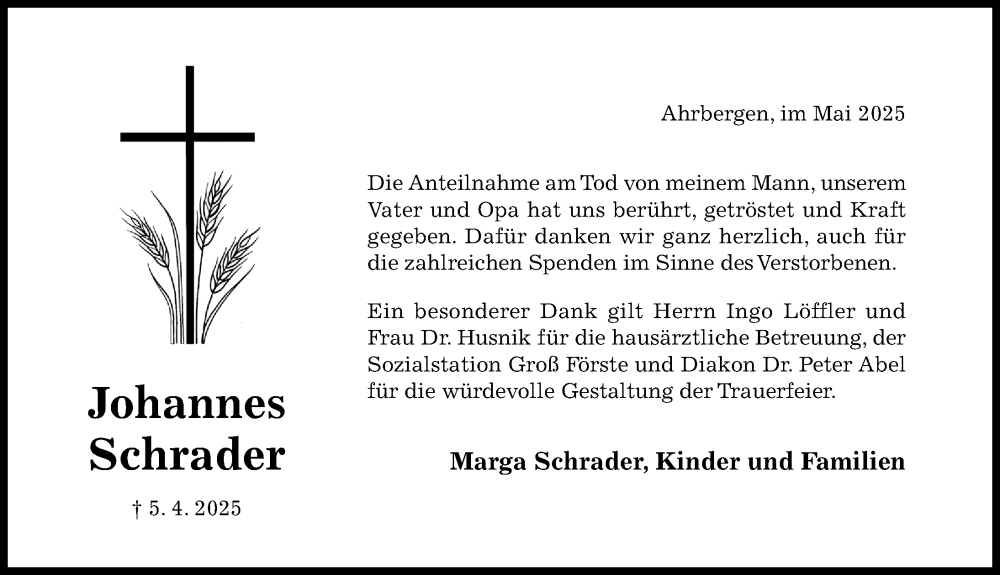 Hier finden Sie alle Traueranzeigen aus der Zeitung, die bisher für Johannes Schrader erschienen sind. Weitere Traueranzeigen, die in der Zeitung erscheinen, werden hier ebenfalls aufgelistet