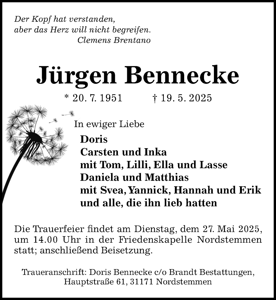Hier finden Sie alle Traueranzeigen aus der Zeitung, die bisher für Jürgen Bennecke erschienen sind. Weitere Traueranzeigen, die in der Zeitung erscheinen, werden hier ebenfalls aufgelistet
