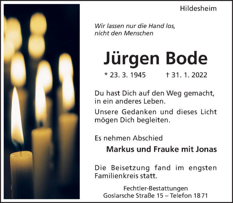 Hier finden Sie alle Traueranzeigen aus der Zeitung, die bisher für Jürgen Bode erschienen sind. Weitere Traueranzeigen, die in der Zeitung erscheinen, werden hier ebenfalls aufgelistet