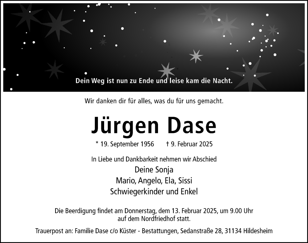 Hier finden Sie alle Traueranzeigen aus der Zeitung, die bisher für Jürgen Dase erschienen sind. Weitere Traueranzeigen, die in der Zeitung erscheinen, werden hier ebenfalls aufgelistet