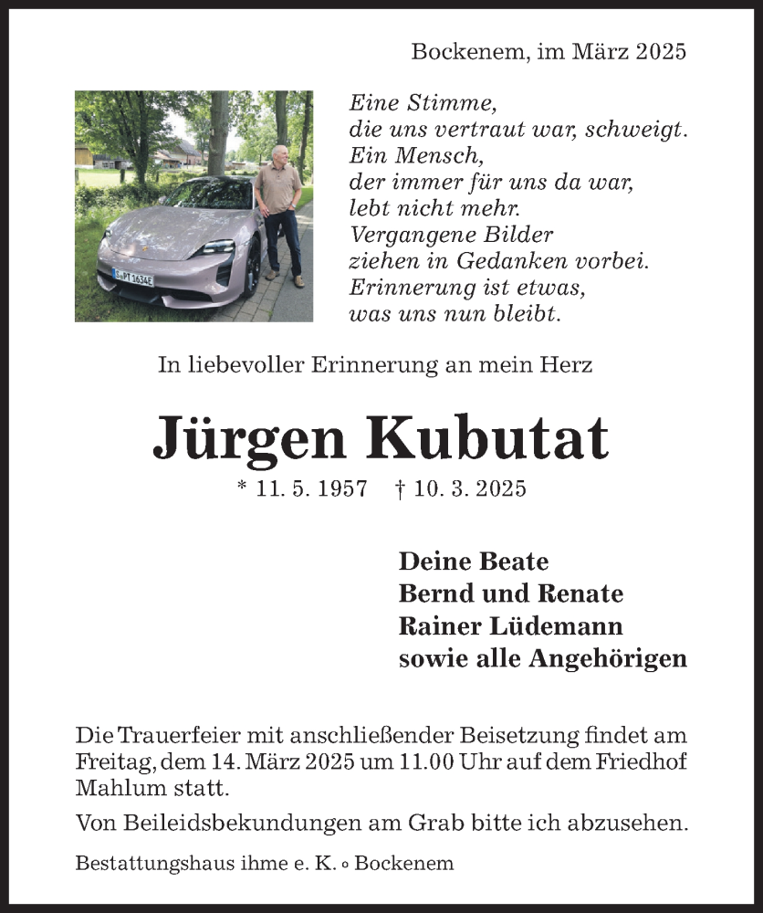 Hier finden Sie alle Traueranzeigen aus der Zeitung, die bisher für Jürgen Kubutat erschienen sind. Weitere Traueranzeigen, die in der Zeitung erscheinen, werden hier ebenfalls aufgelistet
