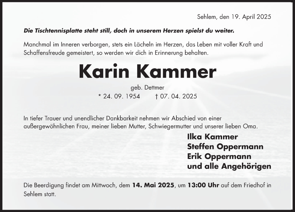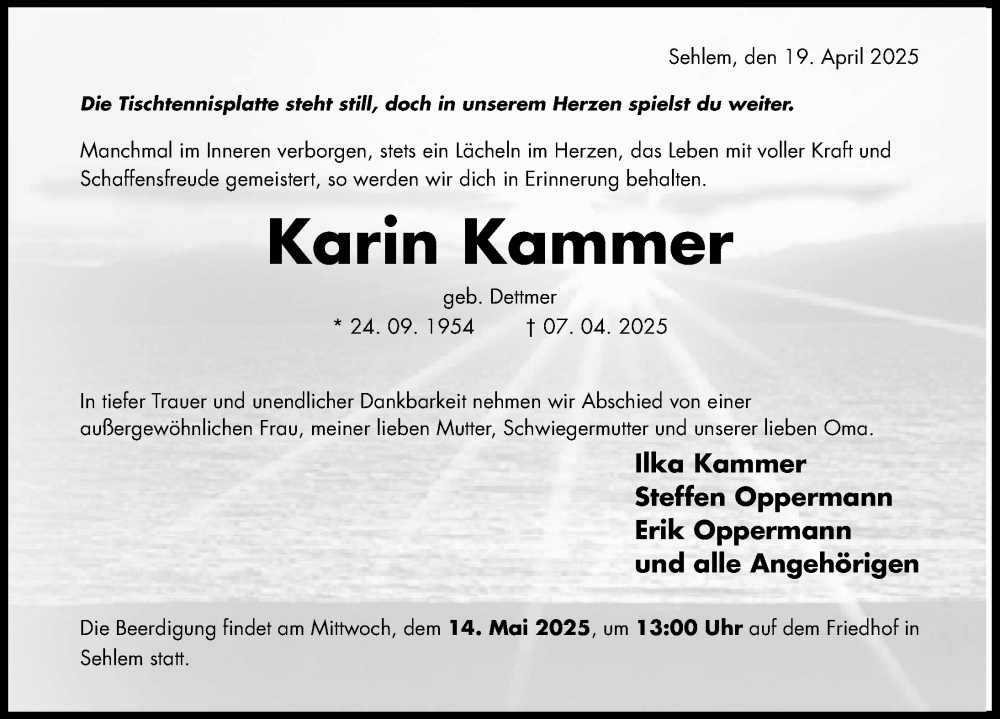 Hier finden Sie alle Traueranzeigen aus der Zeitung, die bisher für Karin Kammer erschienen sind. Weitere Traueranzeigen, die in der Zeitung erscheinen, werden hier ebenfalls aufgelistet