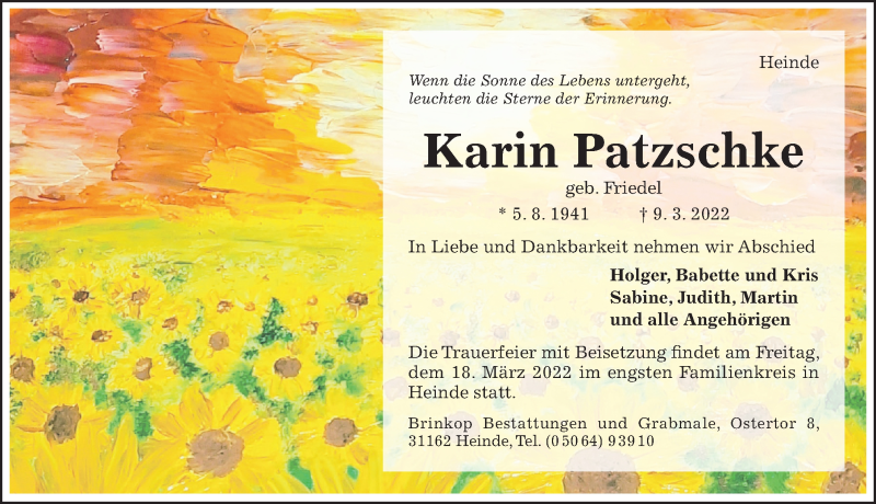 Hier finden Sie alle Traueranzeigen aus der Zeitung, die bisher für Karin Patzschke erschienen sind. Weitere Traueranzeigen, die in der Zeitung erscheinen, werden hier ebenfalls aufgelistet