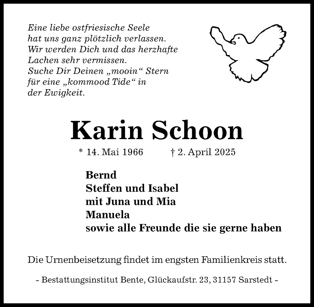 Hier finden Sie alle Traueranzeigen aus der Zeitung, die bisher für Karin Schoon erschienen sind. Weitere Traueranzeigen, die in der Zeitung erscheinen, werden hier ebenfalls aufgelistet