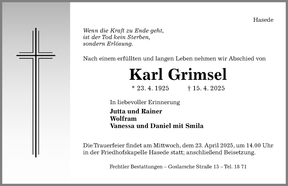 Hier finden Sie alle Traueranzeigen aus der Zeitung, die bisher für Karl Grimsel erschienen sind. Weitere Traueranzeigen, die in der Zeitung erscheinen, werden hier ebenfalls aufgelistet