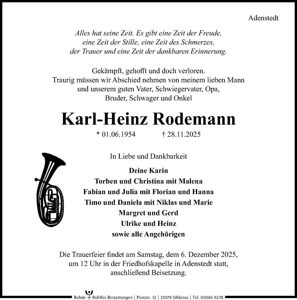 Hier finden Sie alle Traueranzeigen aus der Zeitung, die bisher für Karl-Heinz Rodemann erschienen sind. Weitere Traueranzeigen, die in der Zeitung erscheinen, werden hier ebenfalls aufgelistet
