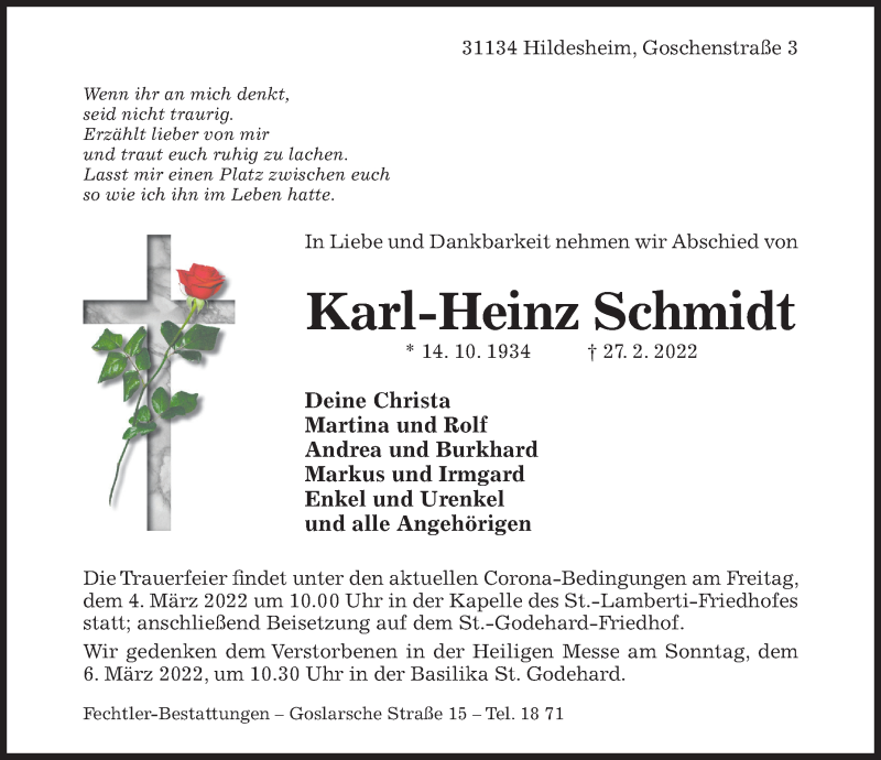 Hier finden Sie alle Traueranzeigen aus der Zeitung, die bisher für Karl-Heinz Schmidt erschienen sind. Weitere Traueranzeigen, die in der Zeitung erscheinen, werden hier ebenfalls aufgelistet