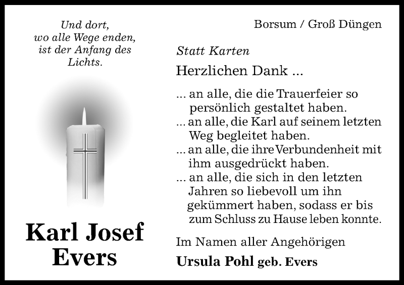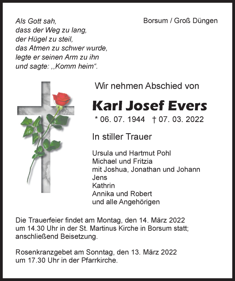 Hier finden Sie alle Traueranzeigen aus der Zeitung, die bisher für Karl Josef Evers erschienen sind. Weitere Traueranzeigen, die in der Zeitung erscheinen, werden hier ebenfalls aufgelistet