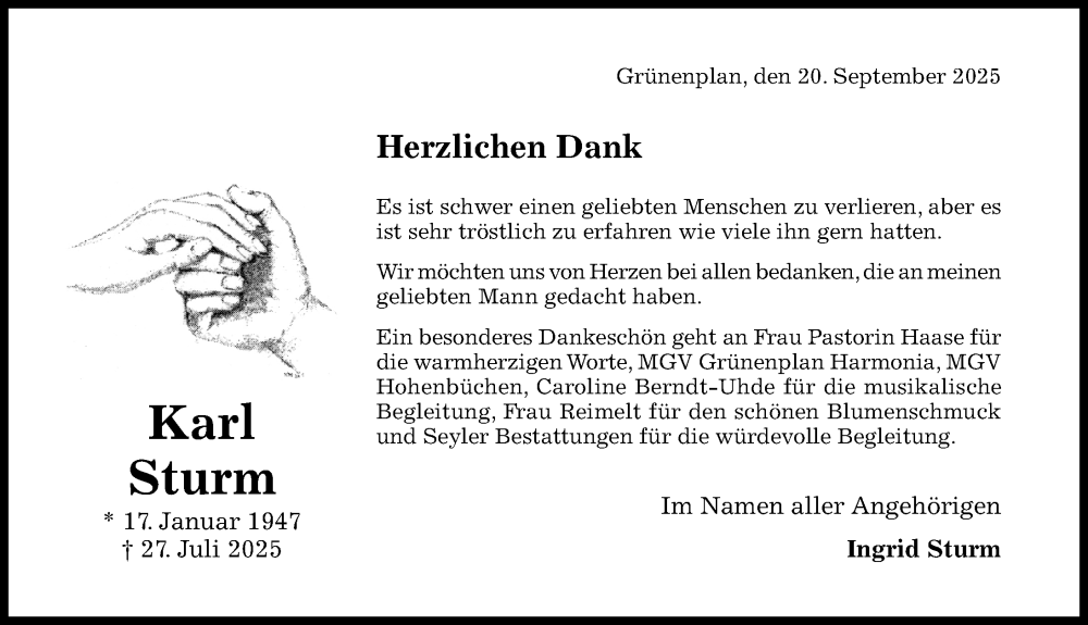 Hier finden Sie alle Traueranzeigen aus der Zeitung, die bisher für Karl Sturm erschienen sind. Weitere Traueranzeigen, die in der Zeitung erscheinen, werden hier ebenfalls aufgelistet