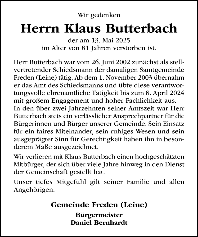 Hier finden Sie alle Traueranzeigen aus der Zeitung, die bisher für Klaus Butterbach erschienen sind. Weitere Traueranzeigen, die in der Zeitung erscheinen, werden hier ebenfalls aufgelistet