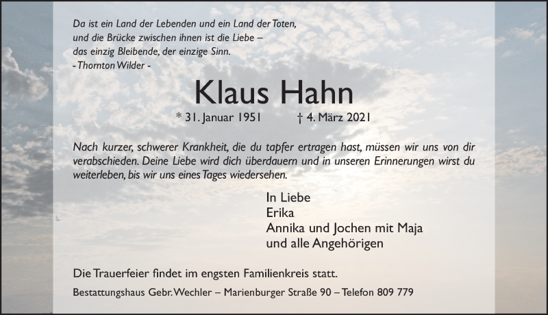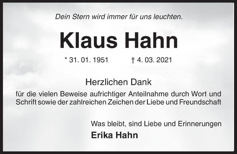 Hier finden Sie alle Traueranzeigen aus der Zeitung, die bisher für Klaus Hahn erschienen sind. Weitere Traueranzeigen, die in der Zeitung erscheinen, werden hier ebenfalls aufgelistet
