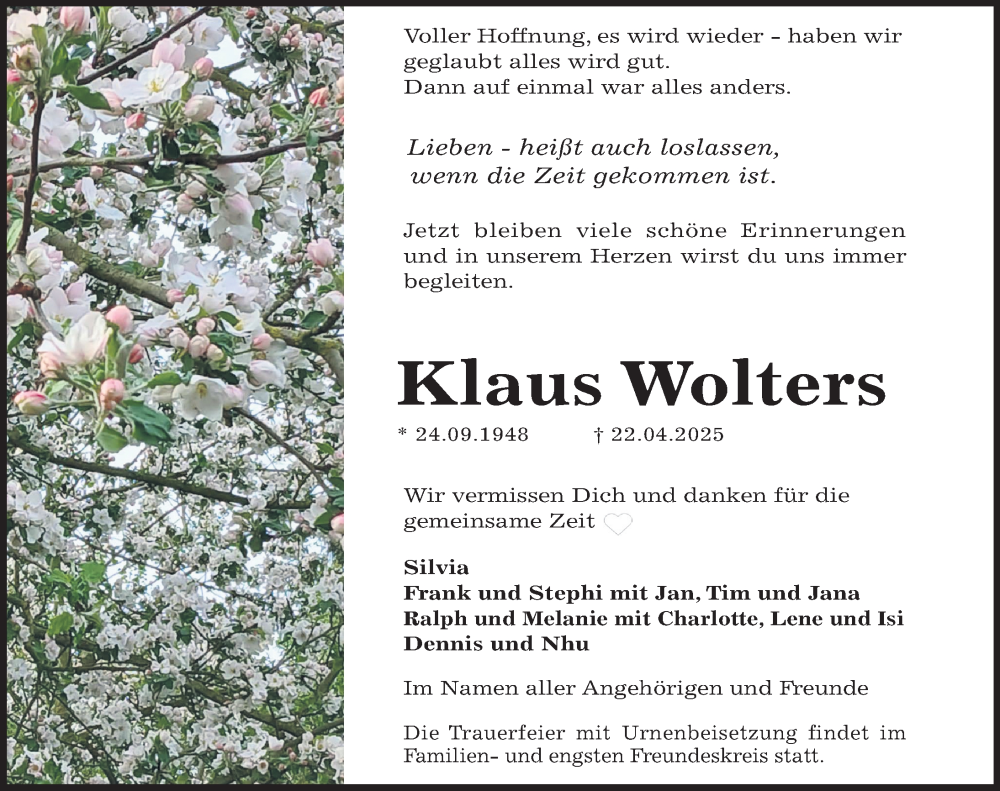 Hier finden Sie alle Traueranzeigen aus der Zeitung, die bisher für Klaus Wolters erschienen sind. Weitere Traueranzeigen, die in der Zeitung erscheinen, werden hier ebenfalls aufgelistet