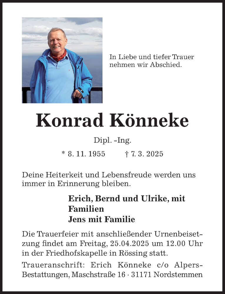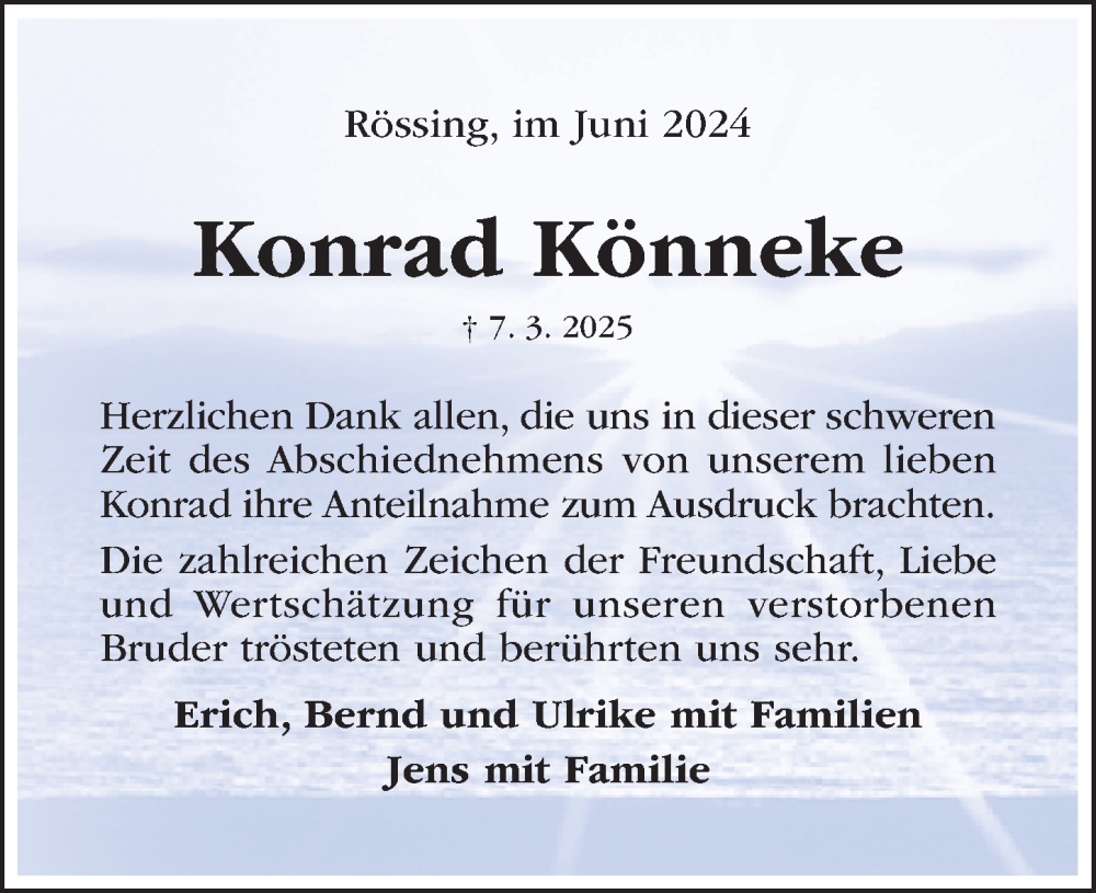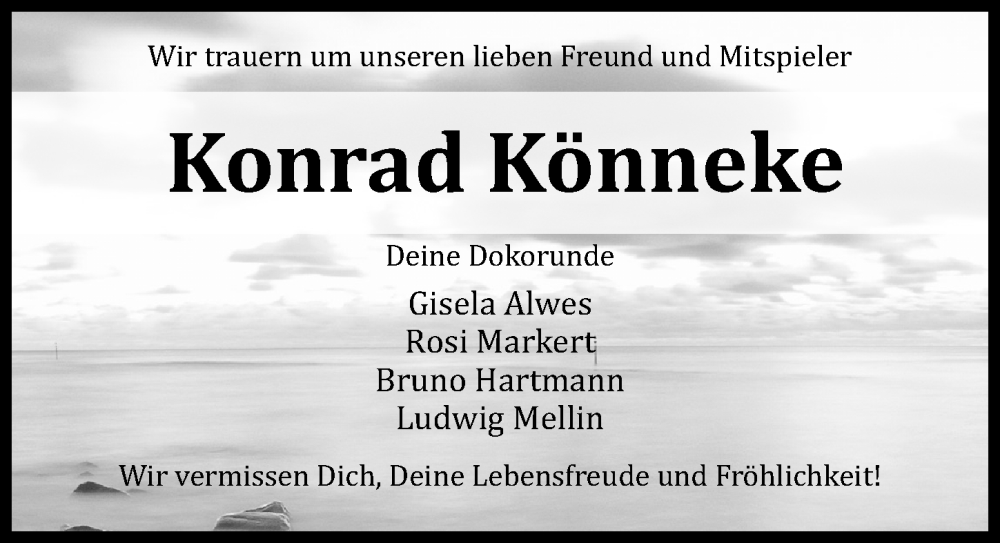 Hier finden Sie alle Traueranzeigen aus der Zeitung, die bisher für Konrad Könneke erschienen sind. Weitere Traueranzeigen, die in der Zeitung erscheinen, werden hier ebenfalls aufgelistet