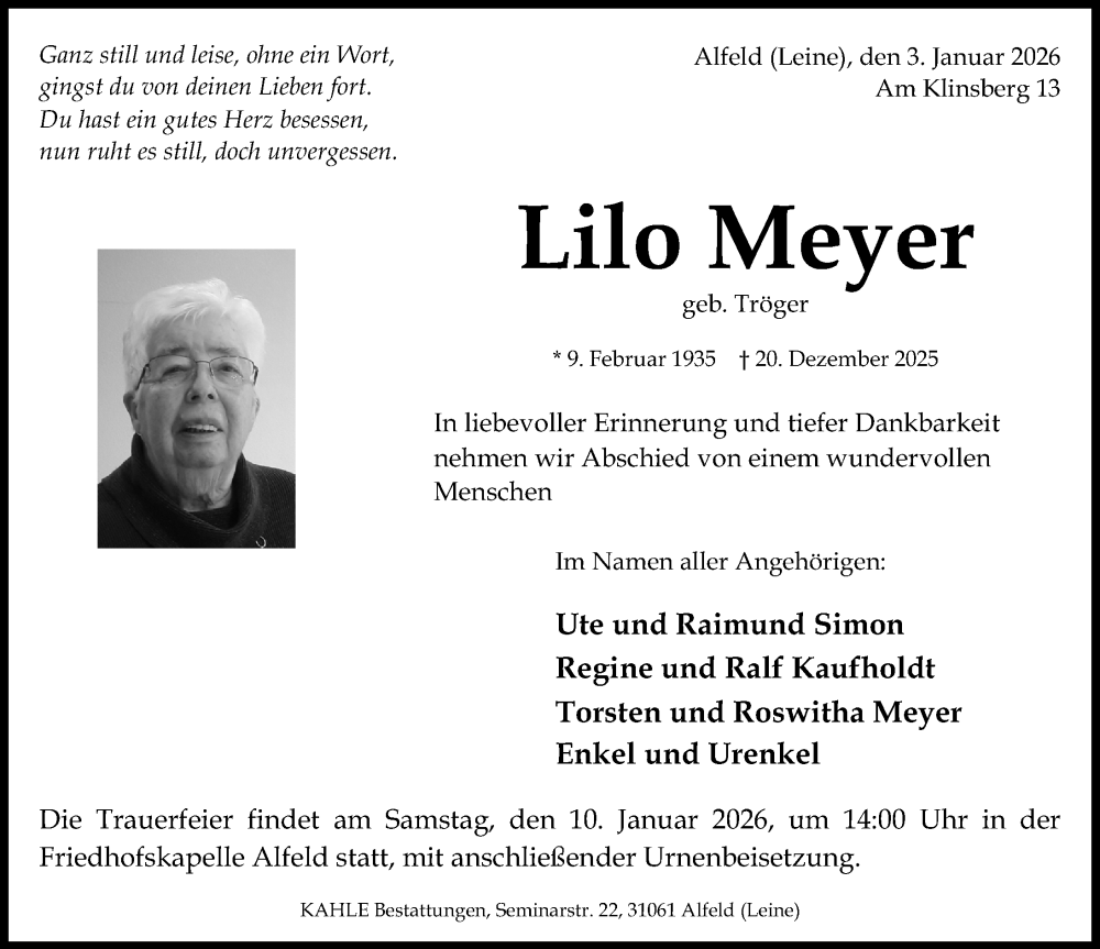 Hier finden Sie alle Traueranzeigen aus der Zeitung, die bisher für Lilo Meyer erschienen sind. Weitere Traueranzeigen, die in der Zeitung erscheinen, werden hier ebenfalls aufgelistet