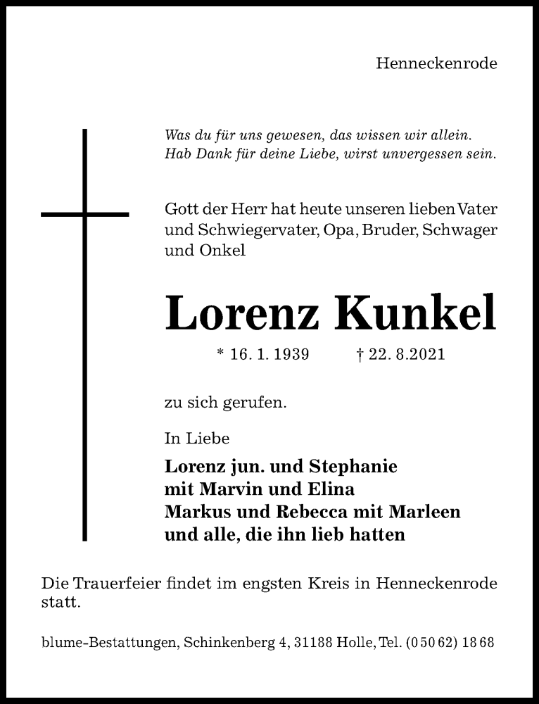 Hier finden Sie alle Traueranzeigen aus der Zeitung, die bisher für Lorenz Kunkel erschienen sind. Weitere Traueranzeigen, die in der Zeitung erscheinen, werden hier ebenfalls aufgelistet