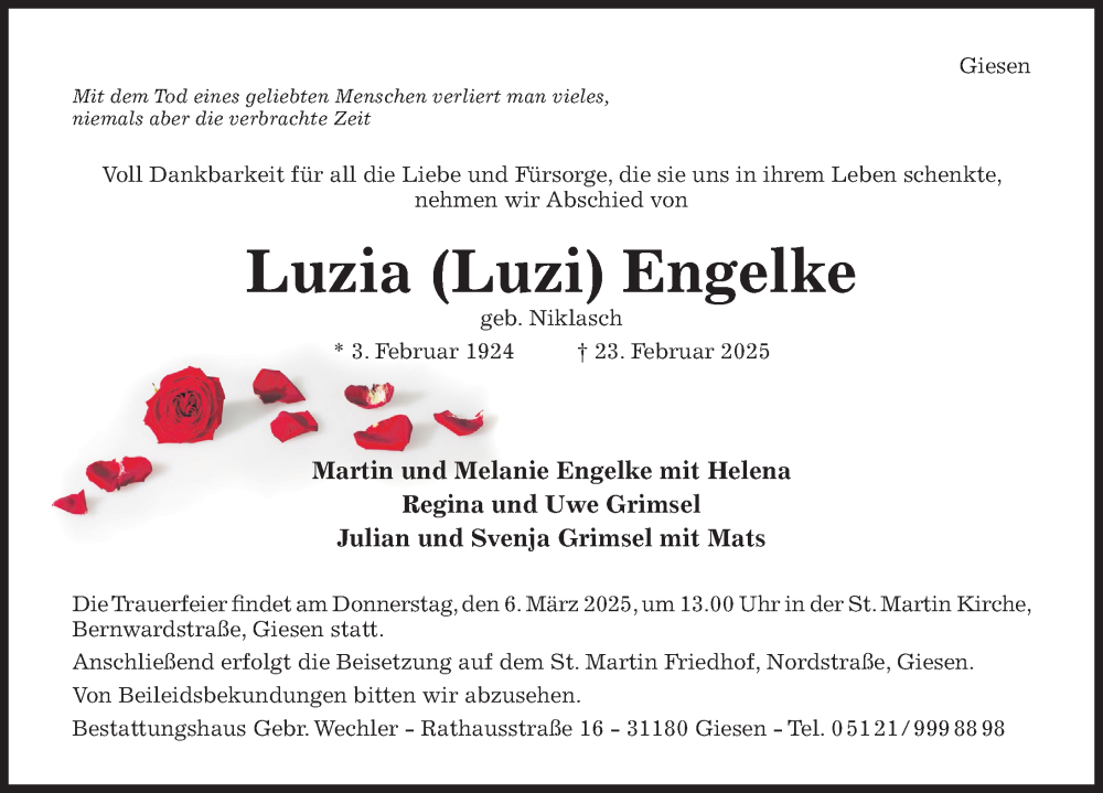 Hier finden Sie alle Traueranzeigen aus der Zeitung, die bisher für Luzia Engelke erschienen sind. Weitere Traueranzeigen, die in der Zeitung erscheinen, werden hier ebenfalls aufgelistet