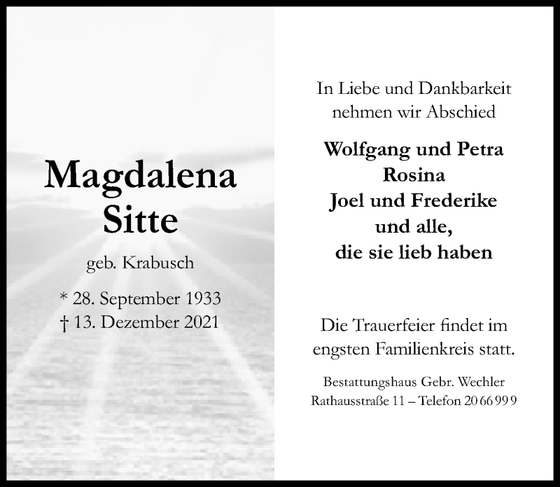 Hier finden Sie alle Traueranzeigen aus der Zeitung, die bisher für Magdalena Sitte erschienen sind. Weitere Traueranzeigen, die in der Zeitung erscheinen, werden hier ebenfalls aufgelistet