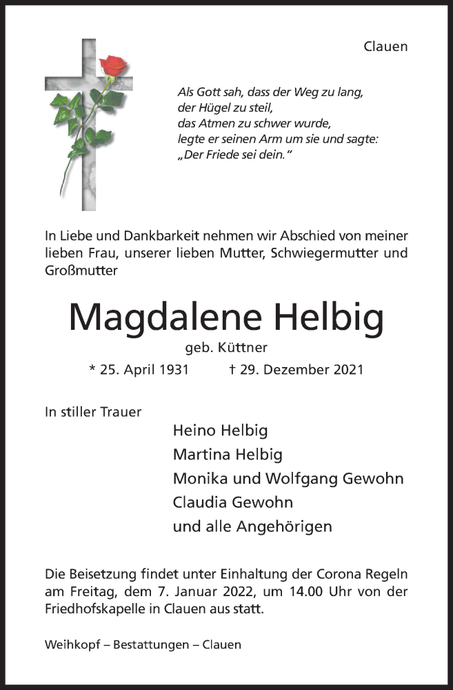 Hier finden Sie alle Traueranzeigen aus der Zeitung, die bisher für Magdalene Helbig erschienen sind. Weitere Traueranzeigen, die in der Zeitung erscheinen, werden hier ebenfalls aufgelistet