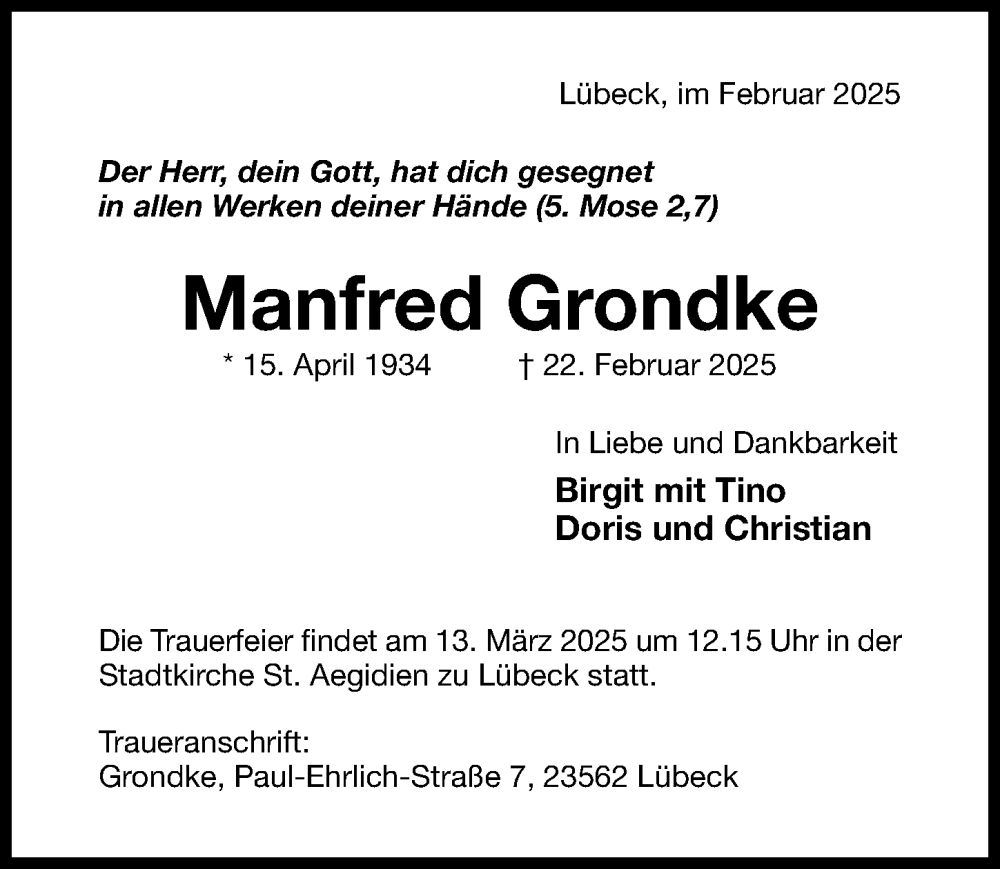 Hier finden Sie alle Traueranzeigen aus der Zeitung, die bisher für Manfred Grondke erschienen sind. Weitere Traueranzeigen, die in der Zeitung erscheinen, werden hier ebenfalls aufgelistet