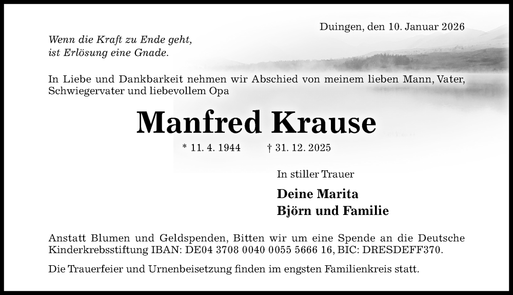 Hier finden Sie alle Traueranzeigen aus der Zeitung, die bisher für Manfred Krause erschienen sind. Weitere Traueranzeigen, die in der Zeitung erscheinen, werden hier ebenfalls aufgelistet