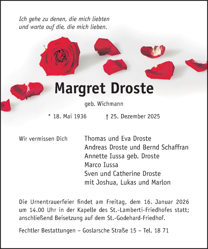 Hier finden Sie alle Traueranzeigen aus der Zeitung, die bisher für Margret Droste erschienen sind. Weitere Traueranzeigen, die in der Zeitung erscheinen, werden hier ebenfalls aufgelistet