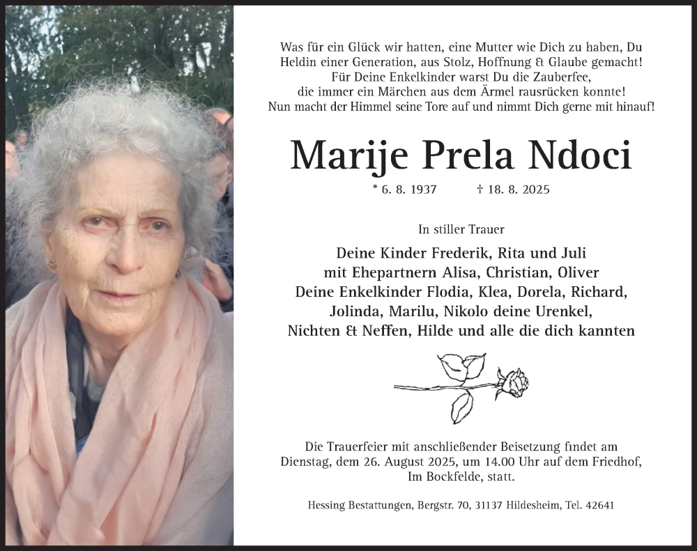 Hier finden Sie alle Traueranzeigen aus der Zeitung, die bisher für Marije Prela Ndoci erschienen sind. Weitere Traueranzeigen, die in der Zeitung erscheinen, werden hier ebenfalls aufgelistet