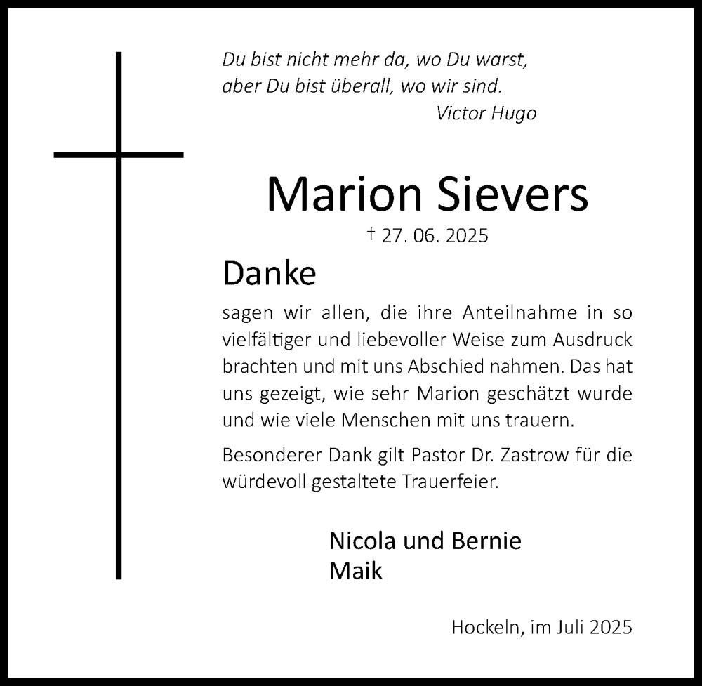 Hier finden Sie alle Traueranzeigen aus der Zeitung, die bisher für Marion Sievers erschienen sind. Weitere Traueranzeigen, die in der Zeitung erscheinen, werden hier ebenfalls aufgelistet