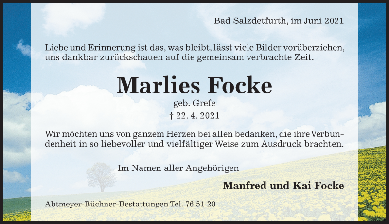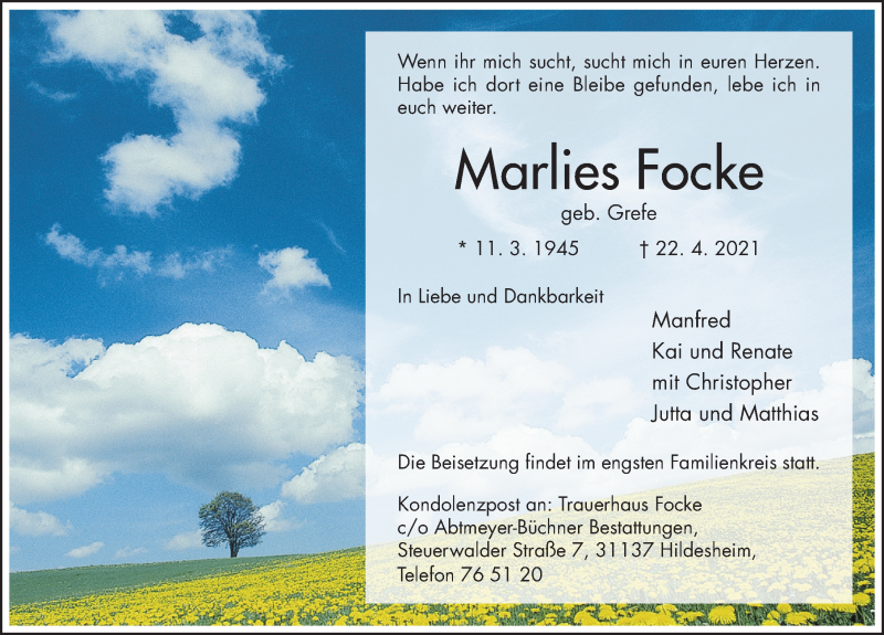 Hier finden Sie alle Traueranzeigen aus der Zeitung, die bisher für Marlies Focke erschienen sind. Weitere Traueranzeigen, die in der Zeitung erscheinen, werden hier ebenfalls aufgelistet