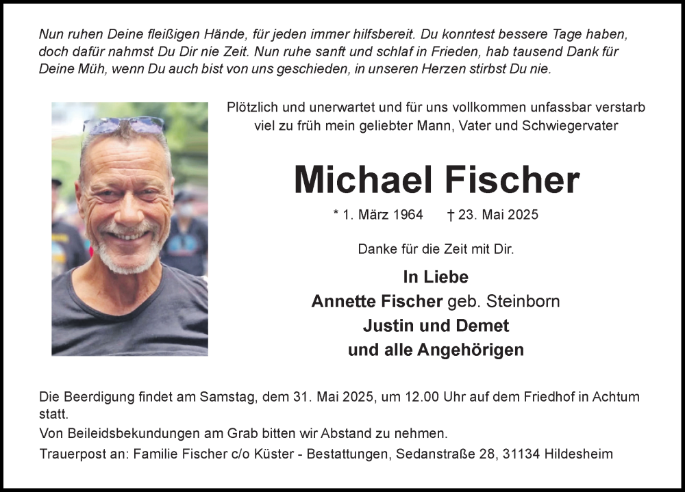 Hier finden Sie alle Traueranzeigen aus der Zeitung, die bisher für Michael Fischer erschienen sind. Weitere Traueranzeigen, die in der Zeitung erscheinen, werden hier ebenfalls aufgelistet