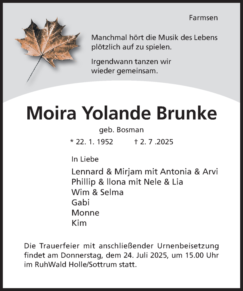 Hier finden Sie alle Traueranzeigen aus der Zeitung, die bisher für Moira Yolande Brunke erschienen sind. Weitere Traueranzeigen, die in der Zeitung erscheinen, werden hier ebenfalls aufgelistet