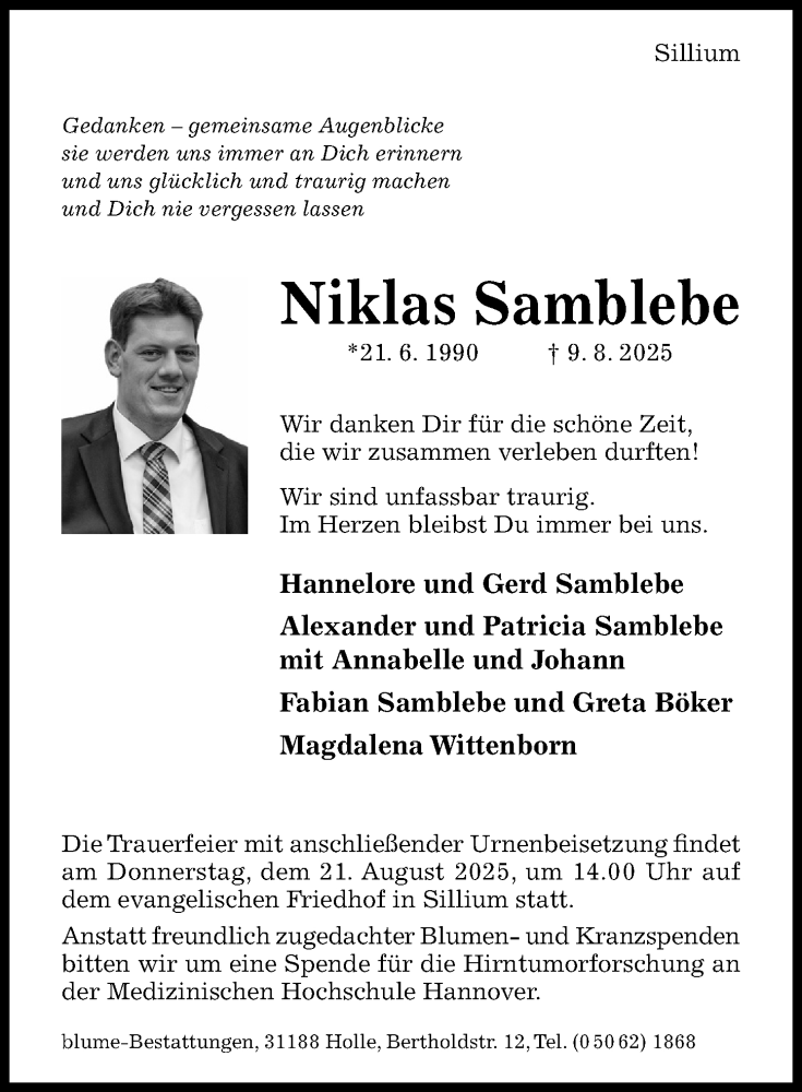 Hier finden Sie alle Traueranzeigen aus der Zeitung, die bisher für Niklas Samblebe erschienen sind. Weitere Traueranzeigen, die in der Zeitung erscheinen, werden hier ebenfalls aufgelistet
