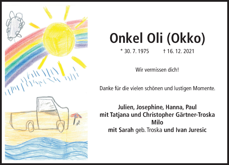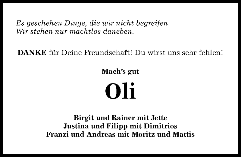 Hier finden Sie alle Traueranzeigen aus der Zeitung, die bisher für Oliver Troska erschienen sind. Weitere Traueranzeigen, die in der Zeitung erscheinen, werden hier ebenfalls aufgelistet