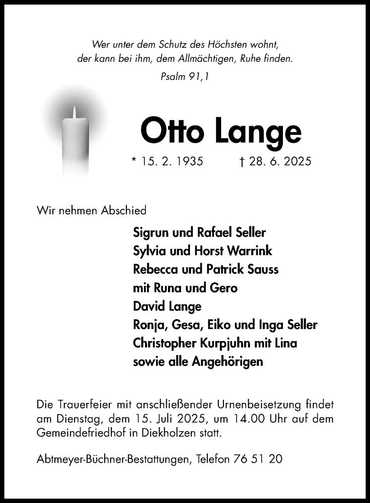 Hier finden Sie alle Traueranzeigen aus der Zeitung, die bisher für Otto Lange erschienen sind. Weitere Traueranzeigen, die in der Zeitung erscheinen, werden hier ebenfalls aufgelistet