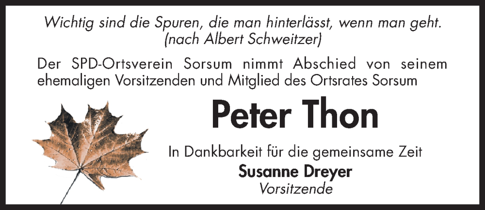 Hier finden Sie alle Traueranzeigen aus der Zeitung, die bisher für Peter Thon erschienen sind. Weitere Traueranzeigen, die in der Zeitung erscheinen, werden hier ebenfalls aufgelistet
