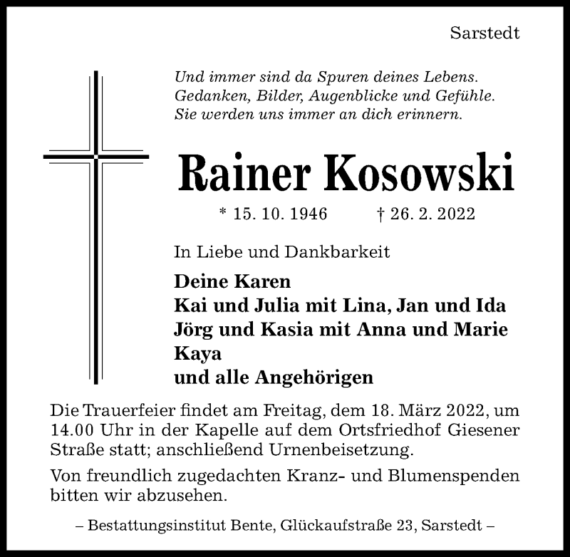 Hier finden Sie alle Traueranzeigen aus der Zeitung, die bisher für Rainer Kosowski erschienen sind. Weitere Traueranzeigen, die in der Zeitung erscheinen, werden hier ebenfalls aufgelistet