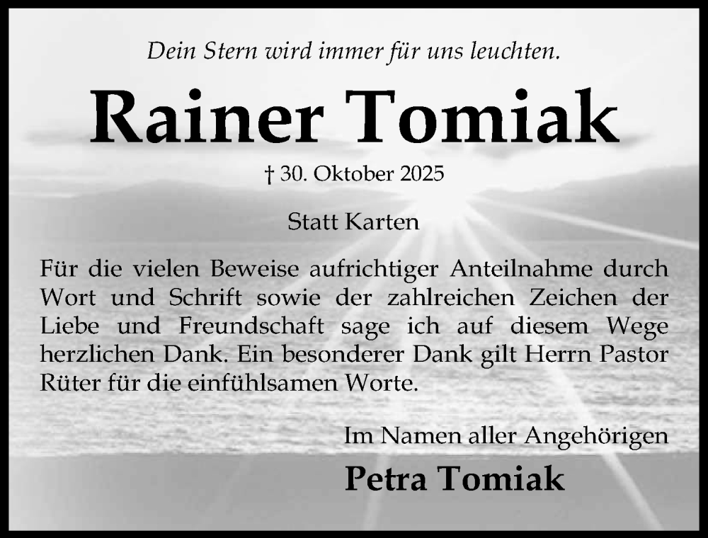 Hier finden Sie alle Traueranzeigen aus der Zeitung, die bisher für Rainer Tomiak erschienen sind. Weitere Traueranzeigen, die in der Zeitung erscheinen, werden hier ebenfalls aufgelistet