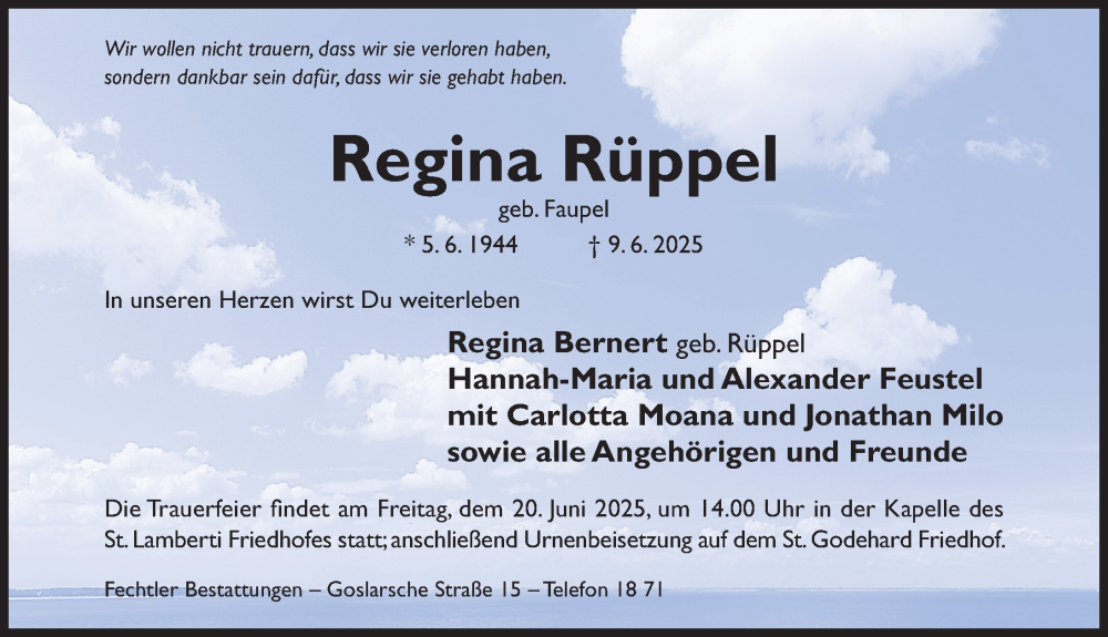 Hier finden Sie alle Traueranzeigen aus der Zeitung, die bisher für Regina Rüppel erschienen sind. Weitere Traueranzeigen, die in der Zeitung erscheinen, werden hier ebenfalls aufgelistet