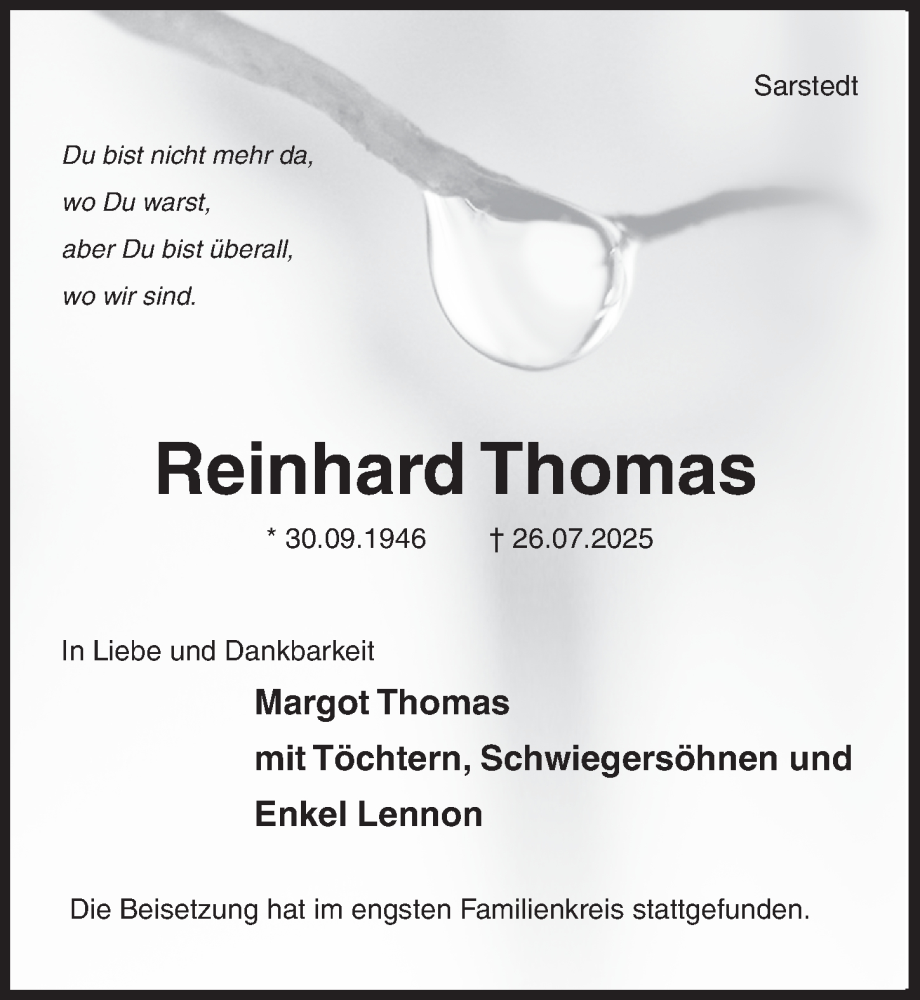 Hier finden Sie alle Traueranzeigen aus der Zeitung, die bisher für Reinhard Thomas erschienen sind. Weitere Traueranzeigen, die in der Zeitung erscheinen, werden hier ebenfalls aufgelistet