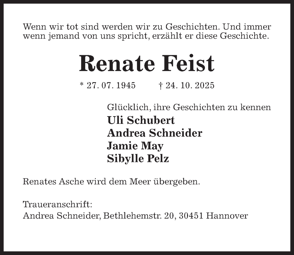 Hier finden Sie alle Traueranzeigen aus der Zeitung, die bisher für Renate Feist erschienen sind. Weitere Traueranzeigen, die in der Zeitung erscheinen, werden hier ebenfalls aufgelistet