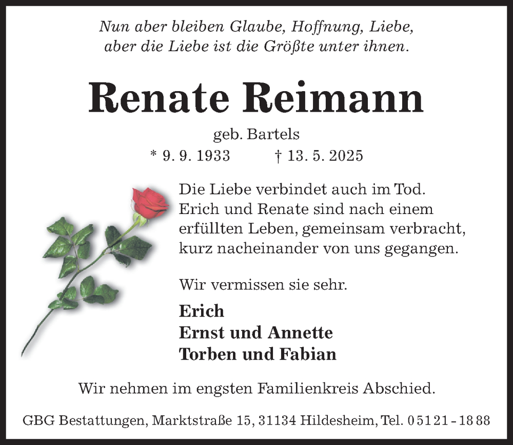 Hier finden Sie alle Traueranzeigen aus der Zeitung, die bisher für Renate Reimann erschienen sind. Weitere Traueranzeigen, die in der Zeitung erscheinen, werden hier ebenfalls aufgelistet