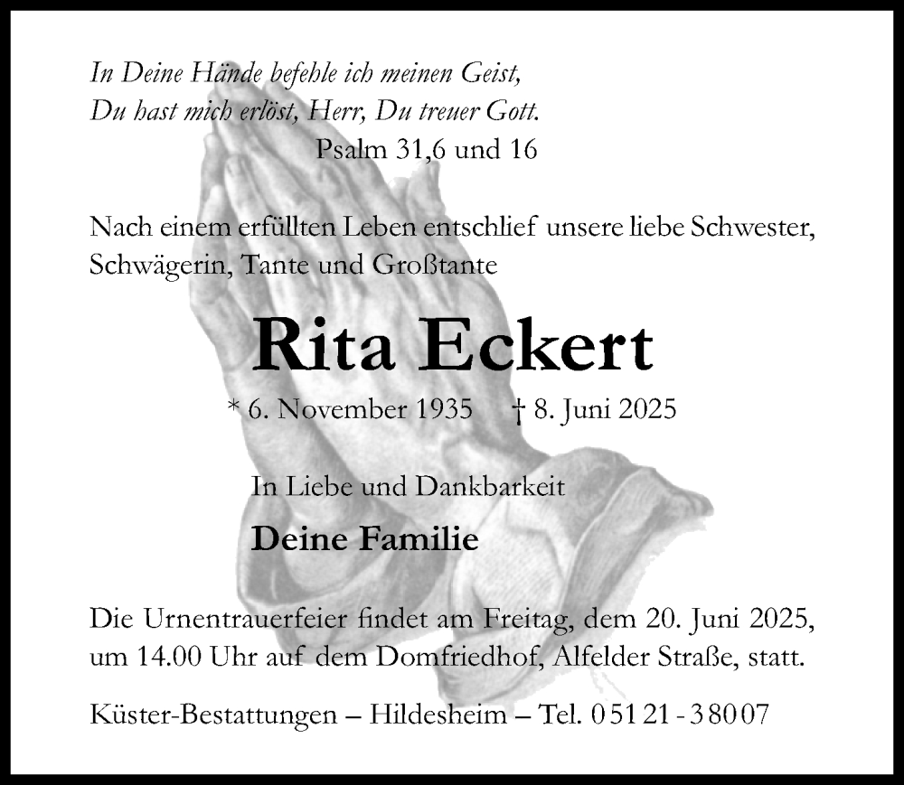 Hier finden Sie alle Traueranzeigen aus der Zeitung, die bisher für Rita Eckert erschienen sind. Weitere Traueranzeigen, die in der Zeitung erscheinen, werden hier ebenfalls aufgelistet