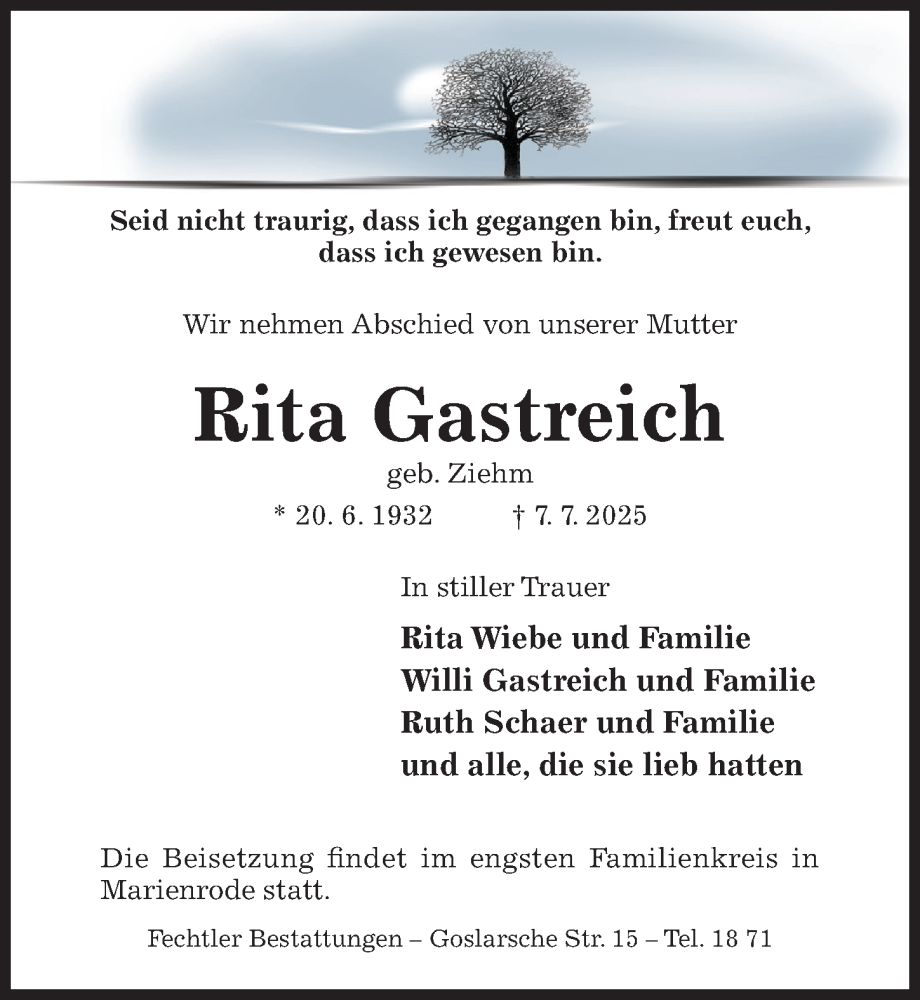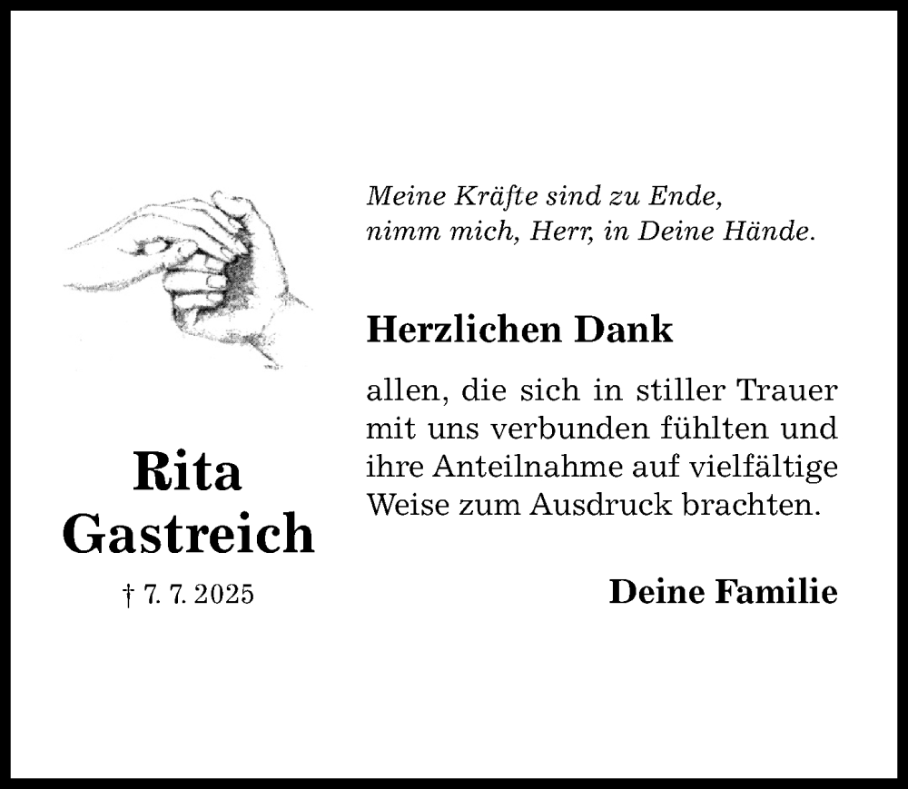 Hier finden Sie alle Traueranzeigen aus der Zeitung, die bisher für Rita Gastreich erschienen sind. Weitere Traueranzeigen, die in der Zeitung erscheinen, werden hier ebenfalls aufgelistet