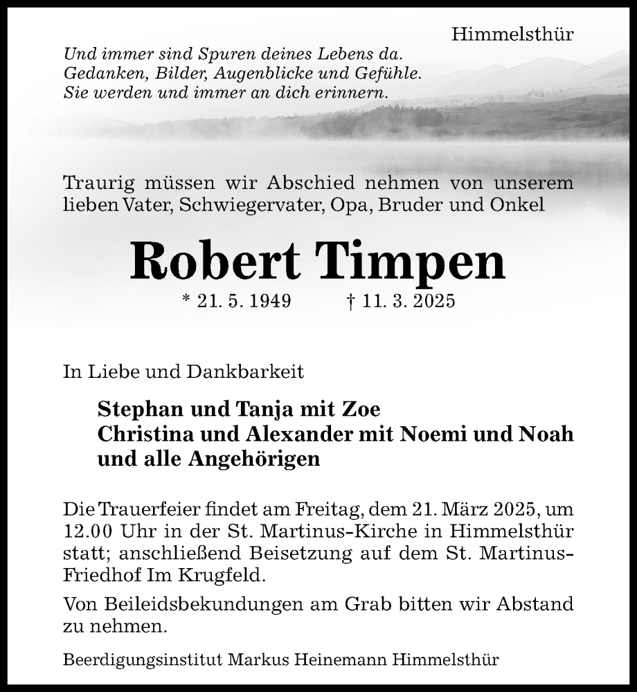 Hier finden Sie alle Traueranzeigen aus der Zeitung, die bisher für Robert Timpen erschienen sind. Weitere Traueranzeigen, die in der Zeitung erscheinen, werden hier ebenfalls aufgelistet